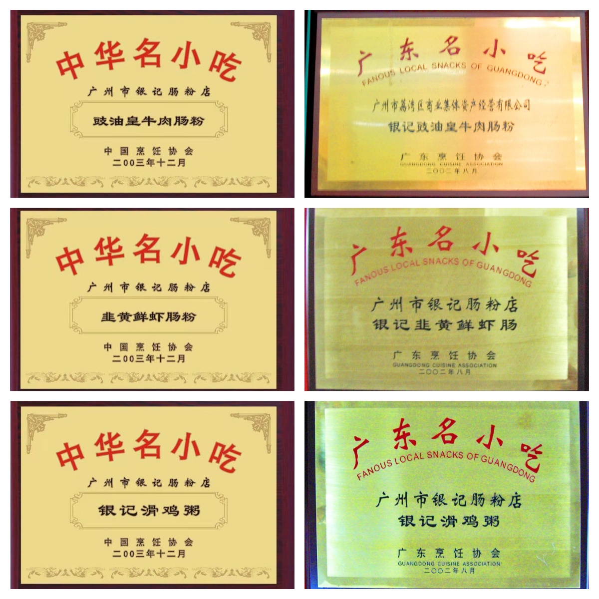 2002年,银记“牛肉肠粉、鲜虾肠粉、滑鸡粥”由广东烹饪协会认定为“广东名小吃”。2003年2月,银记“牛肉肠粉”、“鲜虾肠粉”、“滑鸡粥”由中国烹饪协会认定为“中华名小吃”。