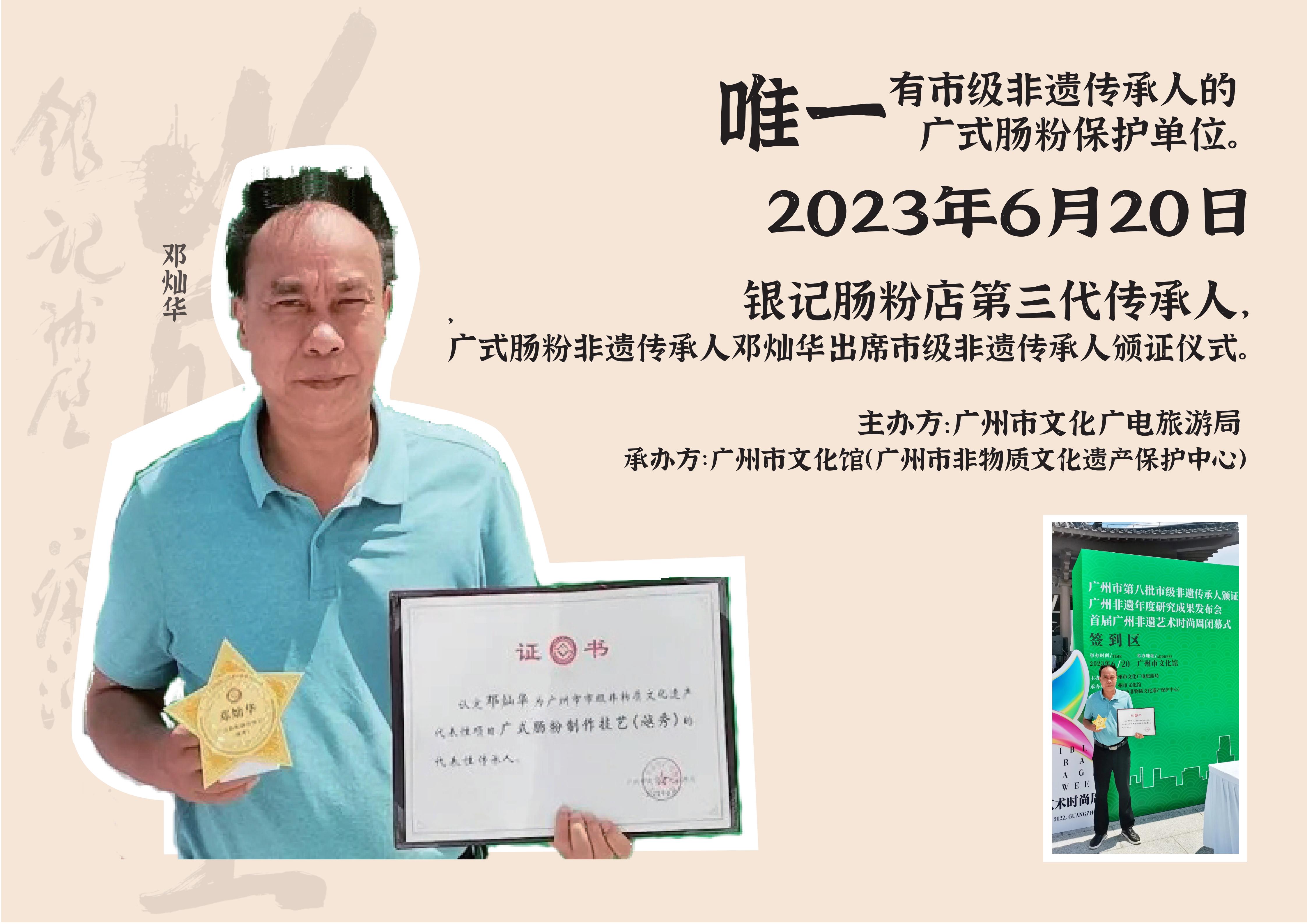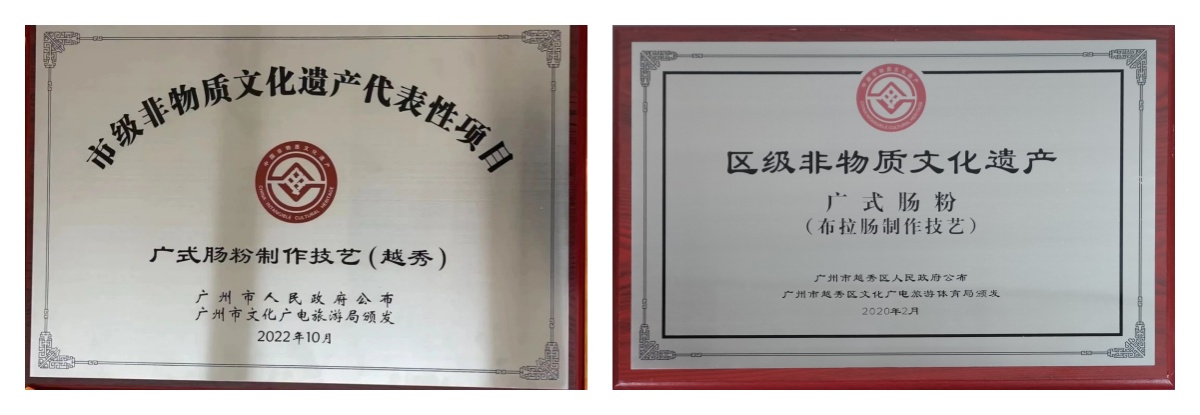 继2020年2月,银记肠粉店的广式肠粉制作技艺入选广州市越秀区非遗代表性项目后,随后在2022年10月晋级广州市第八批市级非遗代表项目。